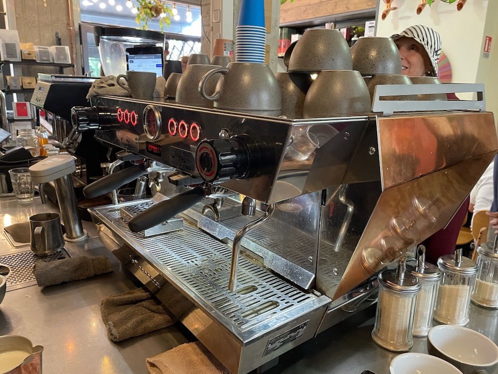 nach etlichen Bieren ein wirklich guter Kaffee. Bohnensorte kannte ich, aber vergessen. Große Maschine und große Mühle. ++