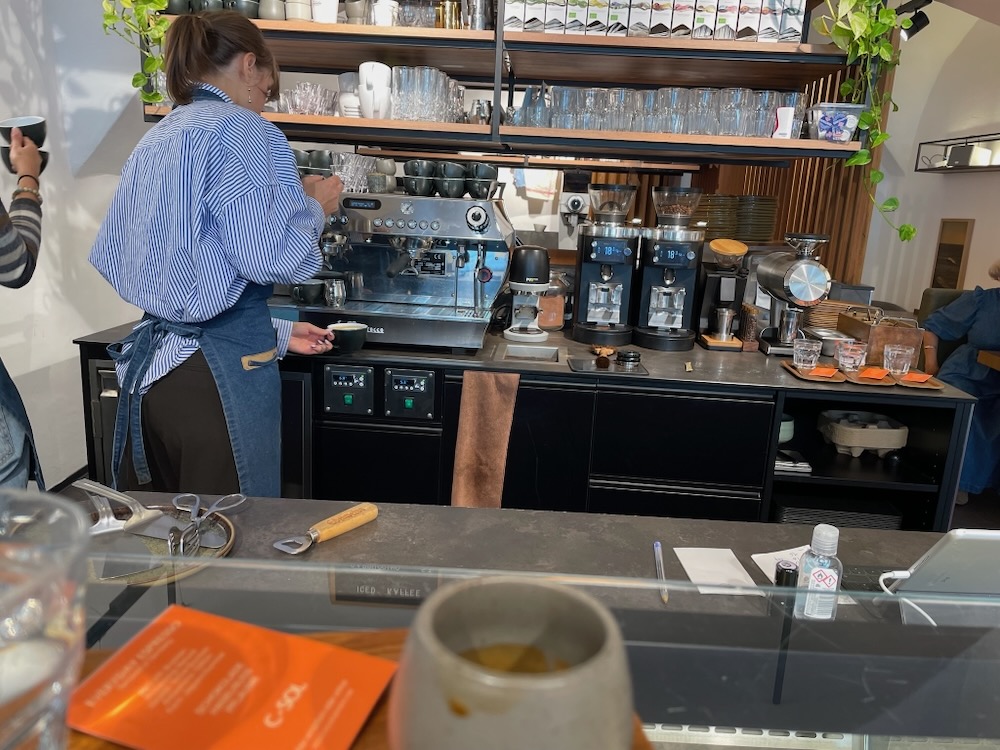 3-gruppige Siebträgermaschine! Viele Kaffeesorten von kleinen Röstern zB auch Süssmund – sehr gemütlich eingerichtet – heute aber Chai latte…